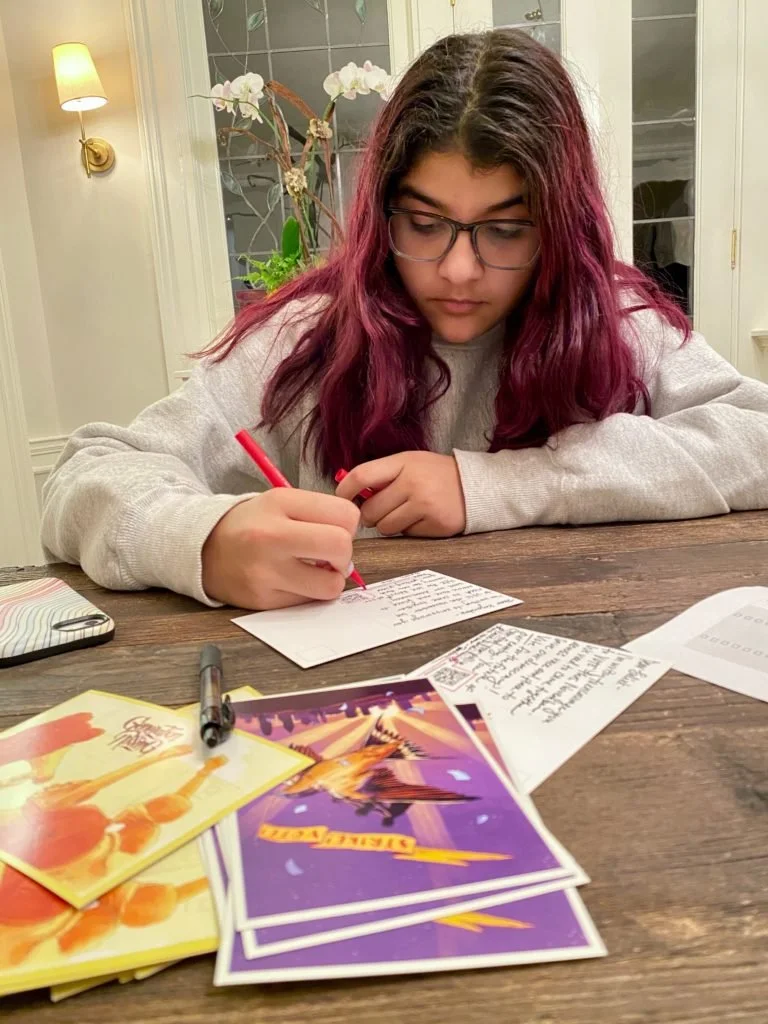 Young Ismaili activist Jena Kassam writes postcards encouraging locals to vote in Atlanta, Georgia, in October 2020. (Photo courtesy Zahra Kassam Mamdani)