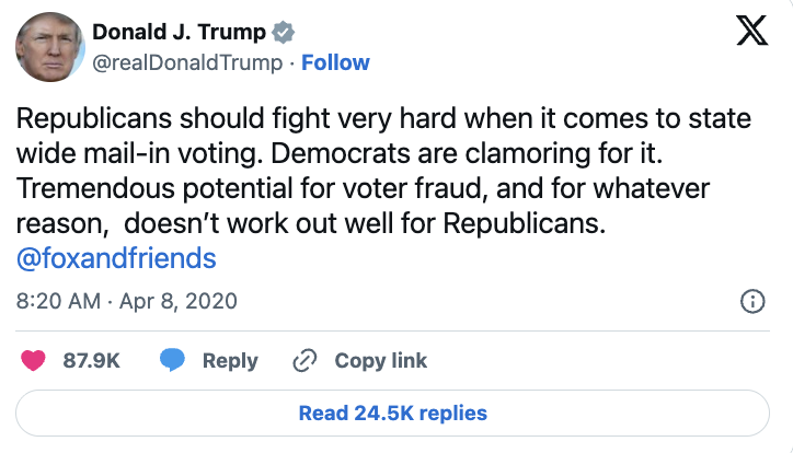 “Democrats are clamoring for it,” President Trump said in an April 8 tweet. “Tremendous potential for voter fraud, and for whatever reason, doesn’t work out well for Republicans.” Though even he voted by mail for the Florida primary, a state where the GOP relies on mailed votes.