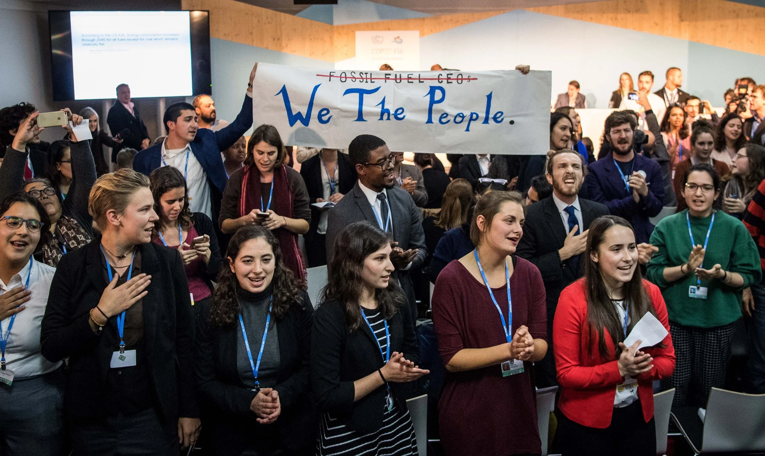 People disturb an event titled: "The Role of Cleaner and More Efficient Fossil Fuels and Nuclear Power in Climate Mitigation" with friendly singing at the COP 23 United Nations Climate Change Conference on November 13, 2017 in Bonn, Germany. The event, organized by the Trump administration and led by a delegation of U.S. coal, nuclear power and gas energy representatives, seeks to make the case for the ongoing use of the three power sources in bridging current global energy demand and the developing capacity of renewable energy sources. (Photo by Lukas Schulze/Getty Images)