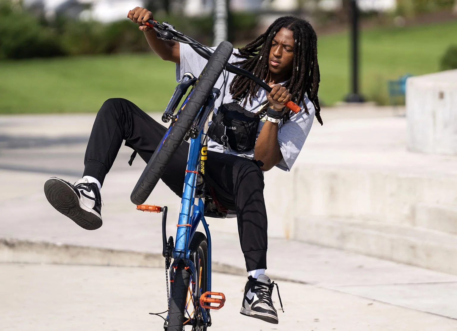 Dice, of Baltimore, rides his bike during BYKE’s pop-up community repair shop at Rash Field Park, in Baltimore, August 1, 2024. Photo By Jessica Gallagher / The Baltimore Banner