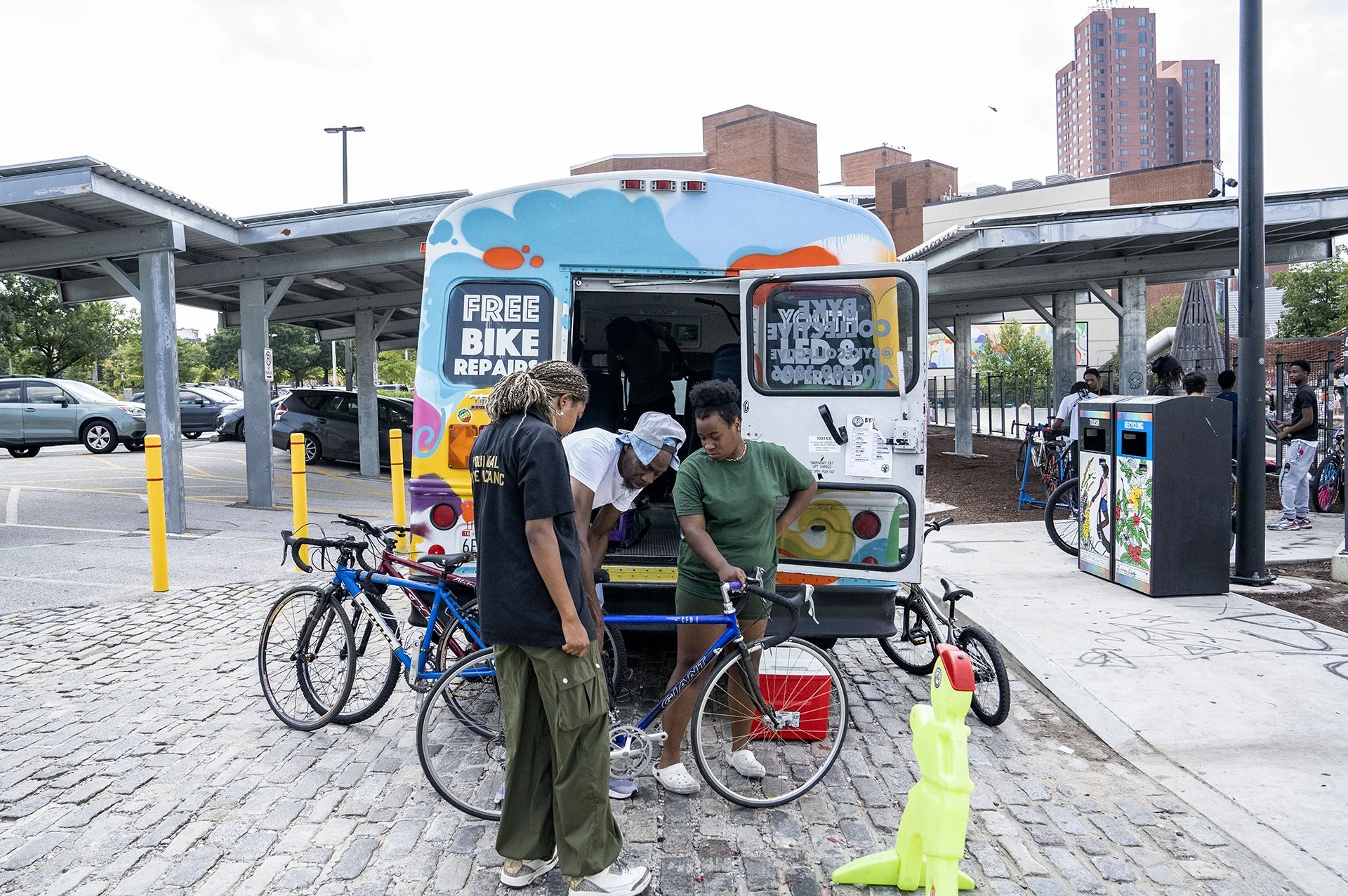 BALTIMORE – Every Thursday afternoon like clockwork, a group of teens in orange aprons huddles around a collection of brightly-colored bikes next to a skate park in the city’s Inner Harbor. Today, two of them are snapping the front derailleur of a blue two-wheeler back into place so the rider can change gears. Another group is swapping a torn brown leather seat for a freshly-covered black one.