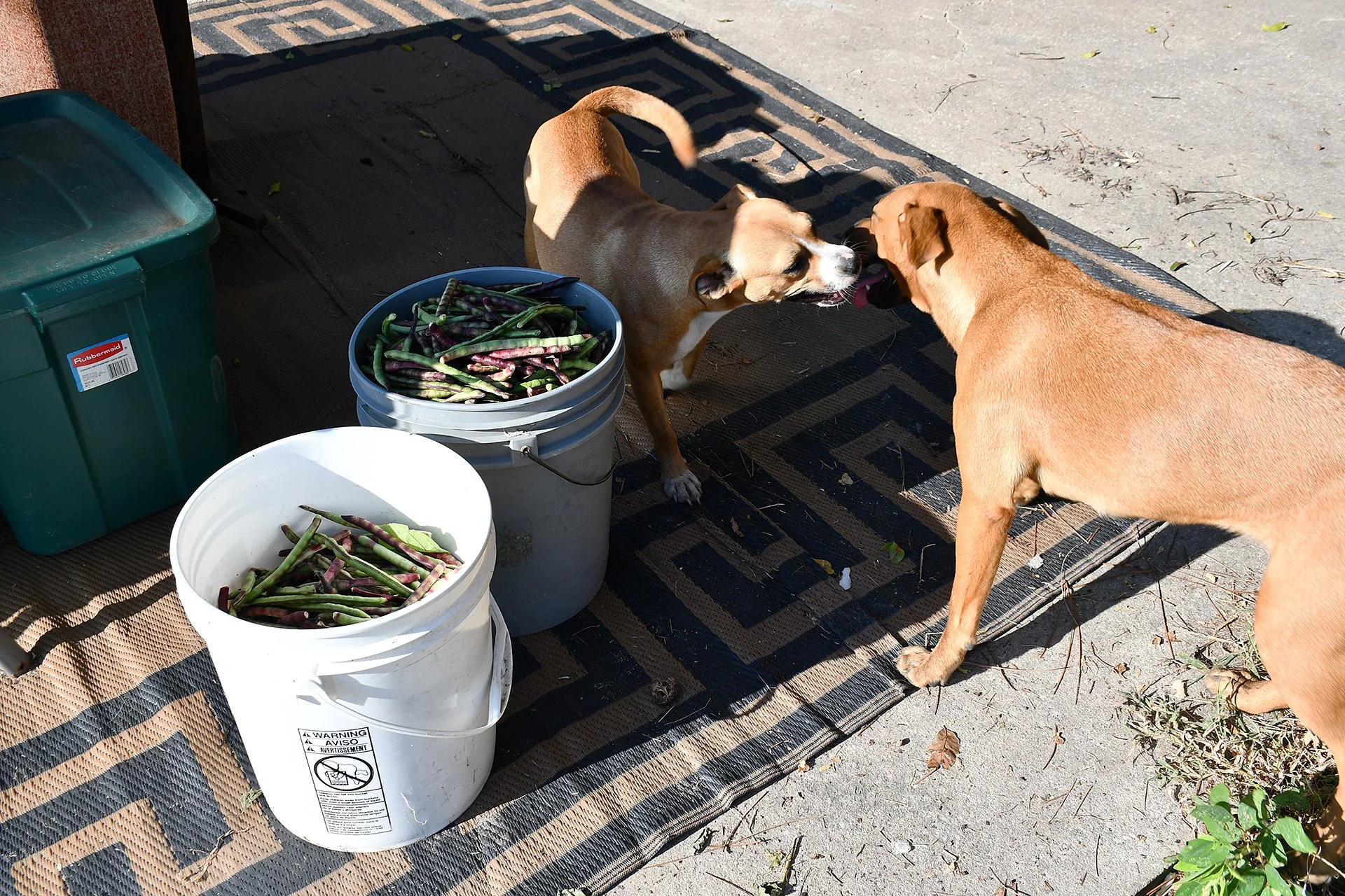 Two farm dogs, a mother and puppy, play near green peas freshly picked by Lawton Wilburn, Erma’s husband, at Wilburn Farms in Worth County. Photo by Lucille Lannigan / Albany Herald