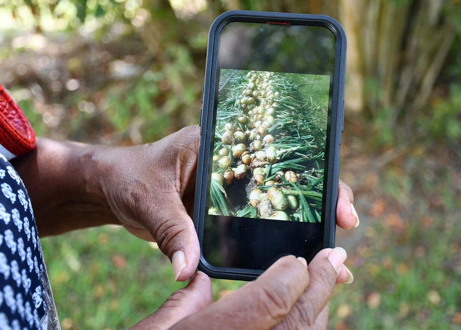 Erma Wilburn shows a photo of harvested onions at Wilburn Farms in Worth County. She calls them the farm’s specialty crop. Photo by Lucille Lannigan / Albany Herald