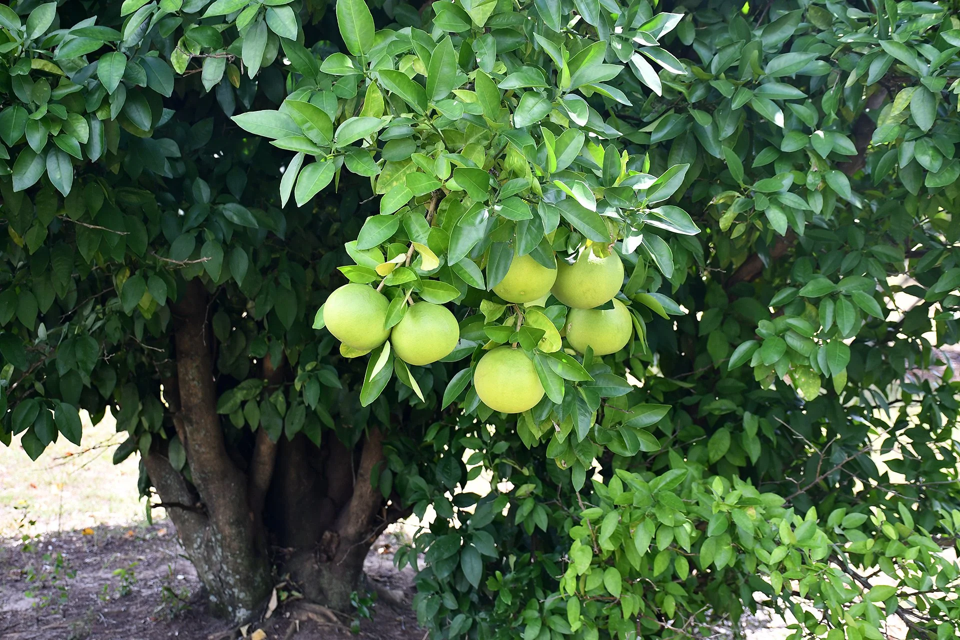 A branch sags with grapefruit on Bessie William’s largest tree in Baker County. The fruit won’t be ripe until October but already boasts a large size. Neighbors, friends and other customers call the Williamses’ grapefruit “the sweetest they’ve ever had.” Photo by Lucille Lannigan / Albany Herald