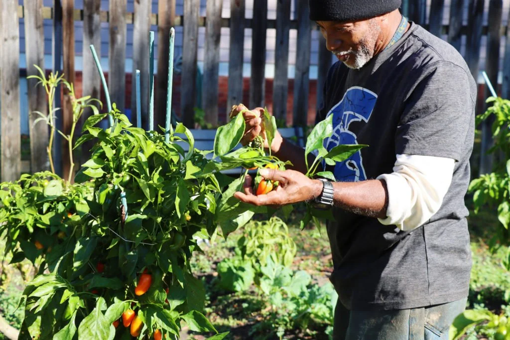 Jamaica harvesting the peppers off the vine at the Lindsay Street garden. (Photo by Bria Suggs/Atlanta Voice)
