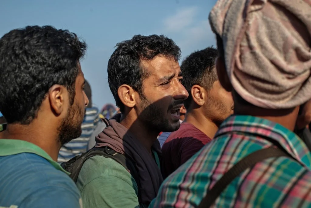 Lesvos, Greece – September 3, 2015. Asaad Sieo, a Syrian military defector, expressed his frustration while waiting for legal documents. Many refugees wait for multiple days in line in order to receive legal documents allowing them to travel further into Greece.