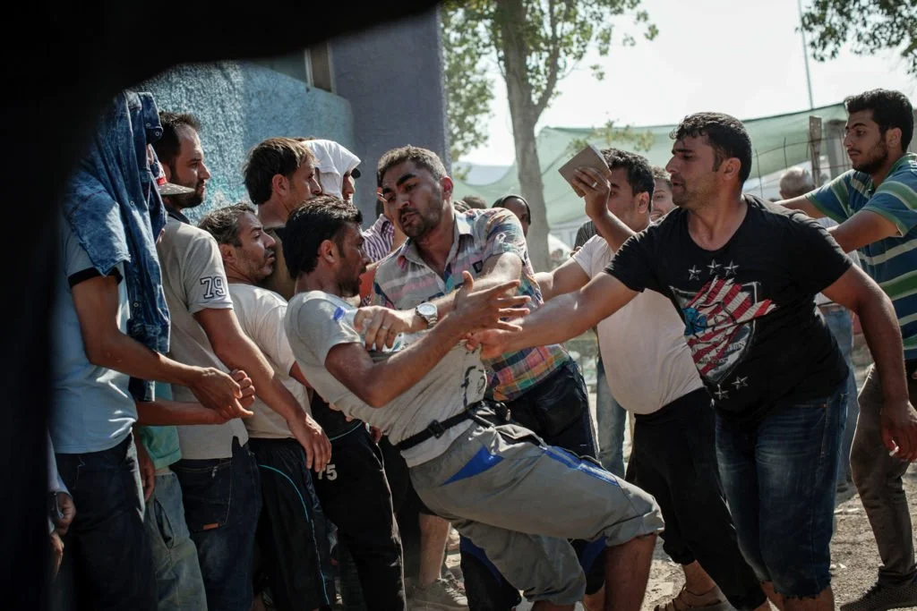 Lesvos, Greece – September 3, 2015. A fight broke out amongst refugees waiting in line to get processed by Greek officials. Many refugees wait for multiple days in line and endure high temperatures with no shade in order to receive legal documents allowing them to travel further into Greece.