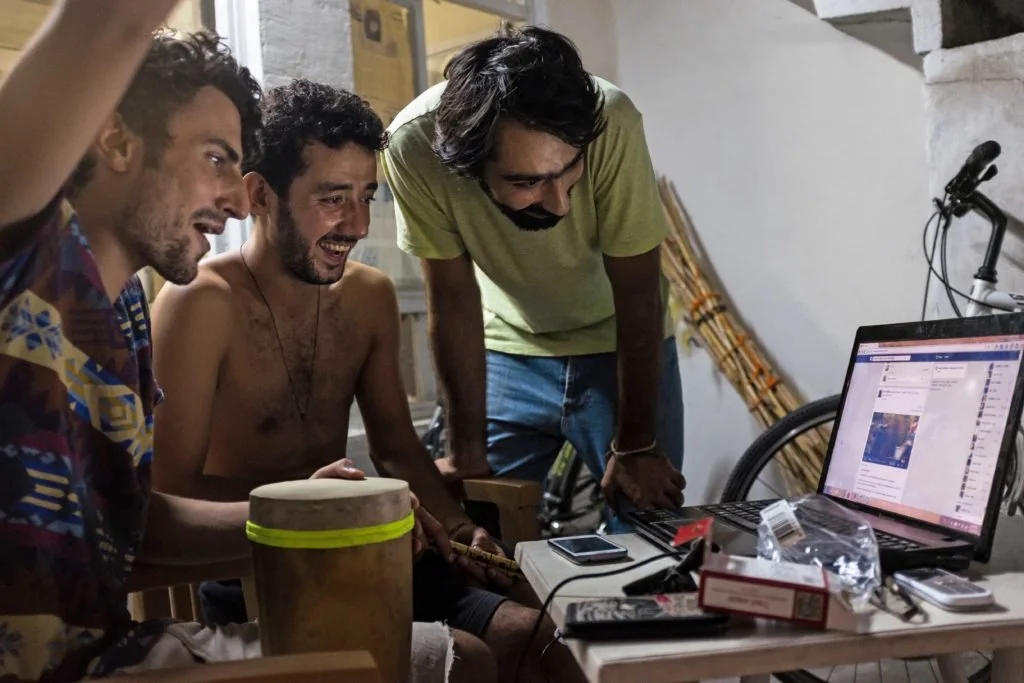 Antakya, Turkey – August 22, 2015. Majd Suliman (left), Asaad Sieo (center) and Mahmoud Hamwi (right) cheered when they watched a video of one of their friends arriving safely to the island of Lesvos by a small boat. Many refugees have been chronicling their journey or sharing information and rumors on social media outlets such as Facebook.