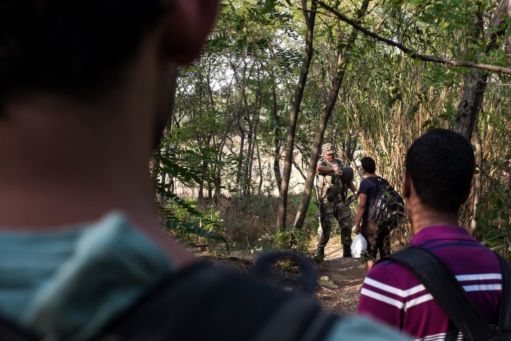 Tsoliades, Greece – September 6, 2015. A Greek soldier redirected a group of refugees navigating sections of woods and fields trying to locate the unofficial border crossing into Macedonia.