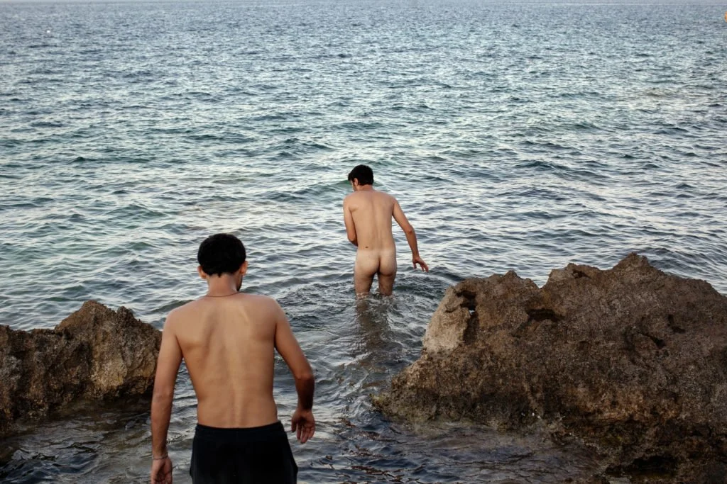 Lesvos, Greece – September 4, 2015. Asaad Sieo (left), a Syrian military defector from Aleppo, and Majd Suliman (right), a Syrian refugee, swam and bathed in the Aegean Sea.