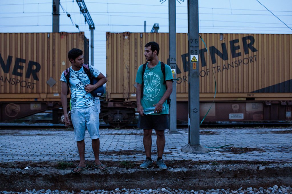 Tsoliades, Greece – September 6, 2015. Syrian refugees Majd Suliman (left) and Asaad Sieo (right) observed their surroundings once they reached an old train platform that acted as an unofficial border crossing into Macedonia from Greece.