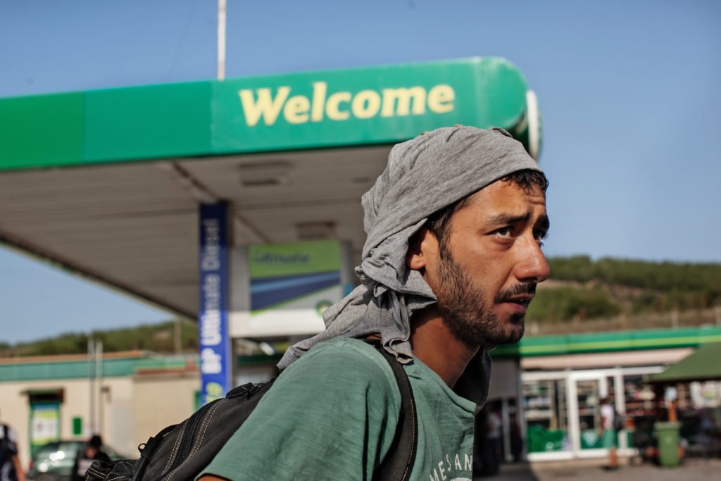 Idomeni, Greece – September 5, 2015. Asaad Sieo, a Syrian military defector, was dropped off at a gas station near the Macedonian border in northern Greece. Regular buses traveling from Athens to this gas station allow refugees to hike to the unofficial border crossing into Macedonia.