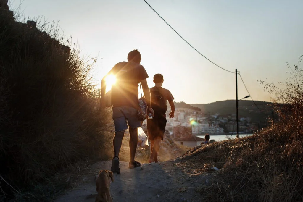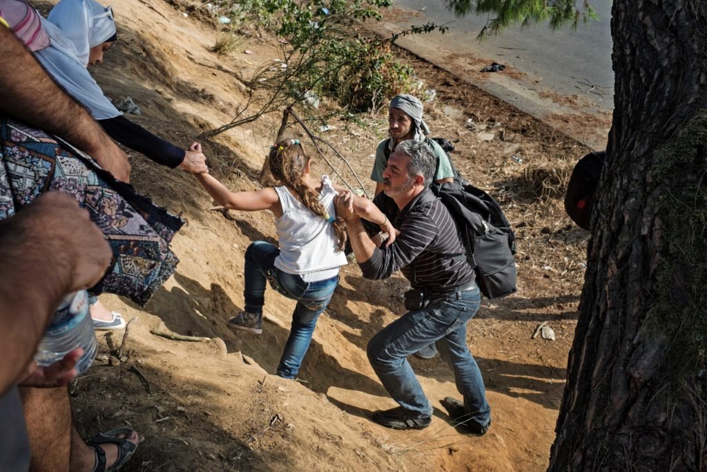 Tsoliades, Greece – September 6, 2015. A man helped a little girl down a steep dirt hill while crossing busy roads en route to the unofficial border crossing into Macedonia from Greece.
