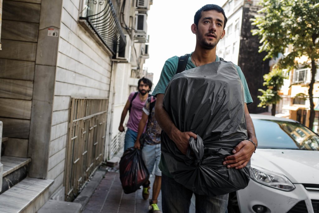 Istanbul, Turkey – August 29, 2015. Asaad Sieo, a Syrian military defector from Aleppo, carried a large garbage bag filled with life vests as he walked to the Faith Mosque in Aksaray, Istanbul.