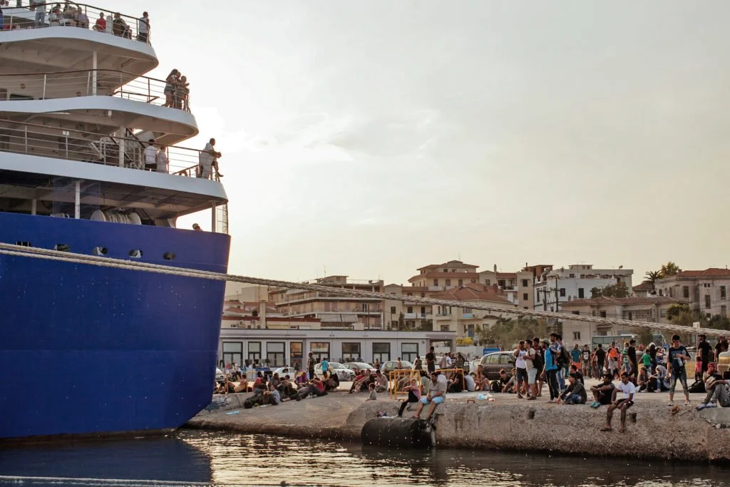 The passengers of a luxury cruise ship in Lesvos, Greece looked down at a large group of refugees at the processing center located at the Mytilini Port Authority. Many refugees wait for multiple days in line in order to receive legal documents allowing them to travel further into Greece.