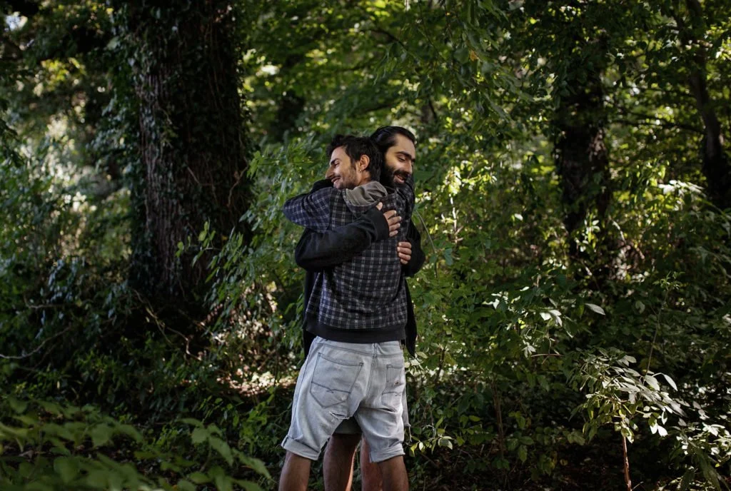 Herten, Germany – September 10, 2015. Syrian refugees Majd Suliman (right) and Mahmoud Hamwi (left) embraced each in celebration other outside of a processing camp in a small northern German town. Many trains arriving in Munich that are en route to Berlin are being rerouted to smaller cities or towns because of the influx of refugees in bigger cities.