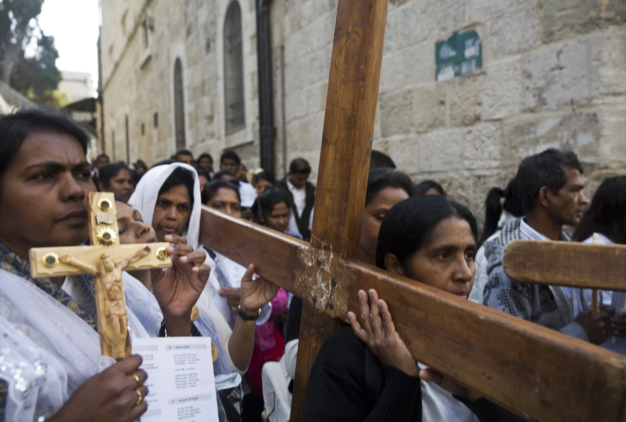 Christian pilgrims from Indonesia carry wooden crosses along Via Dolorosa, or “The Way of Sorrow,” in the Old City of Jerusalem on April 14, 2017. Good Friday marks the holy day of remembrance when Jesus was sentenced to death and crucified, and it comes before the celebration of Easter Sunday, when Christian faith holds that Jesus rose from the dead and will come again. (Photo by Heidi Levine)