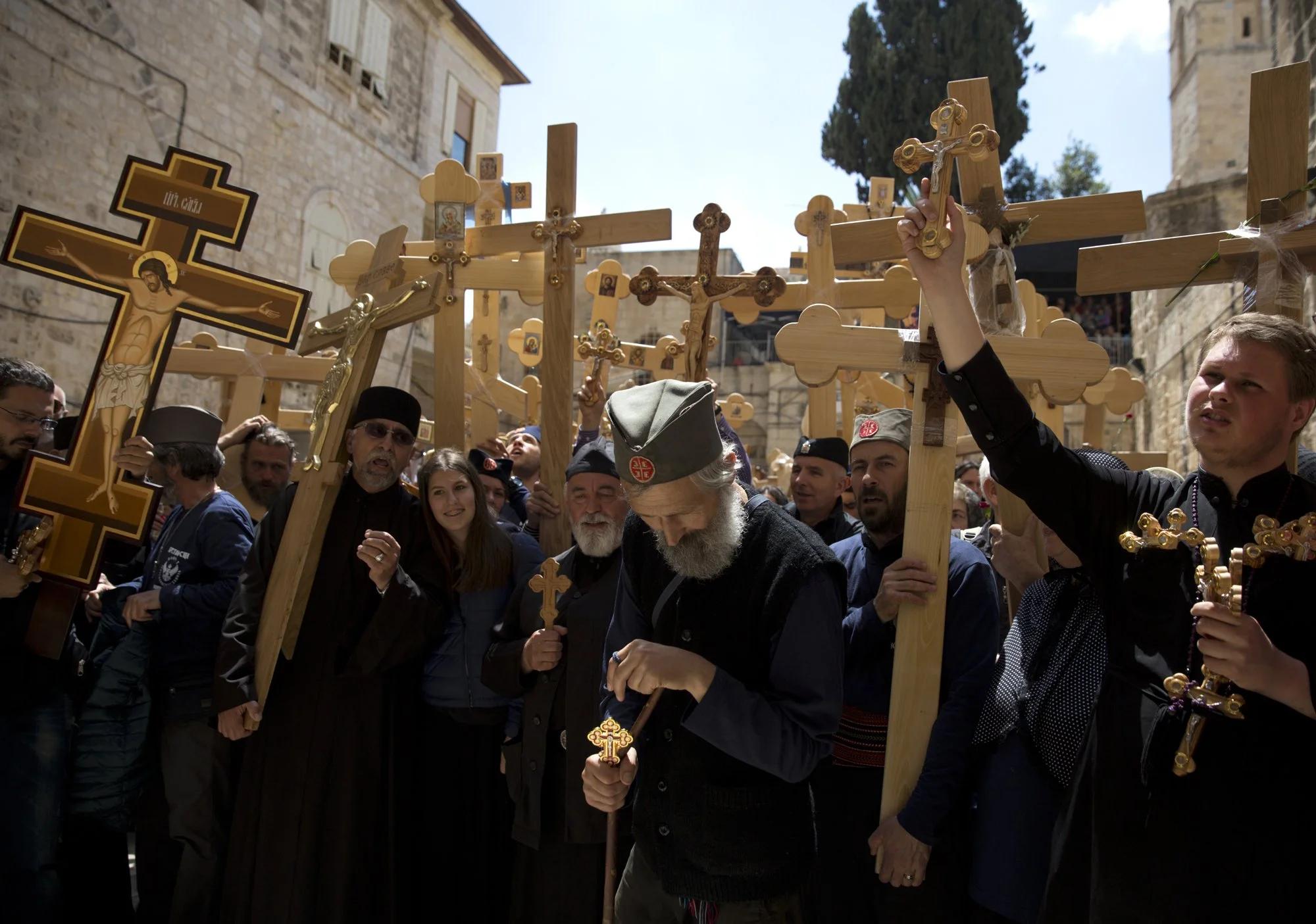 Christian Orthodox pilgrims from Serbia pray and sing, carrying wooden crosses before entering the Church of the Holy Sepulchre on April 14, 2017. (Photo by Heidi Levine)
