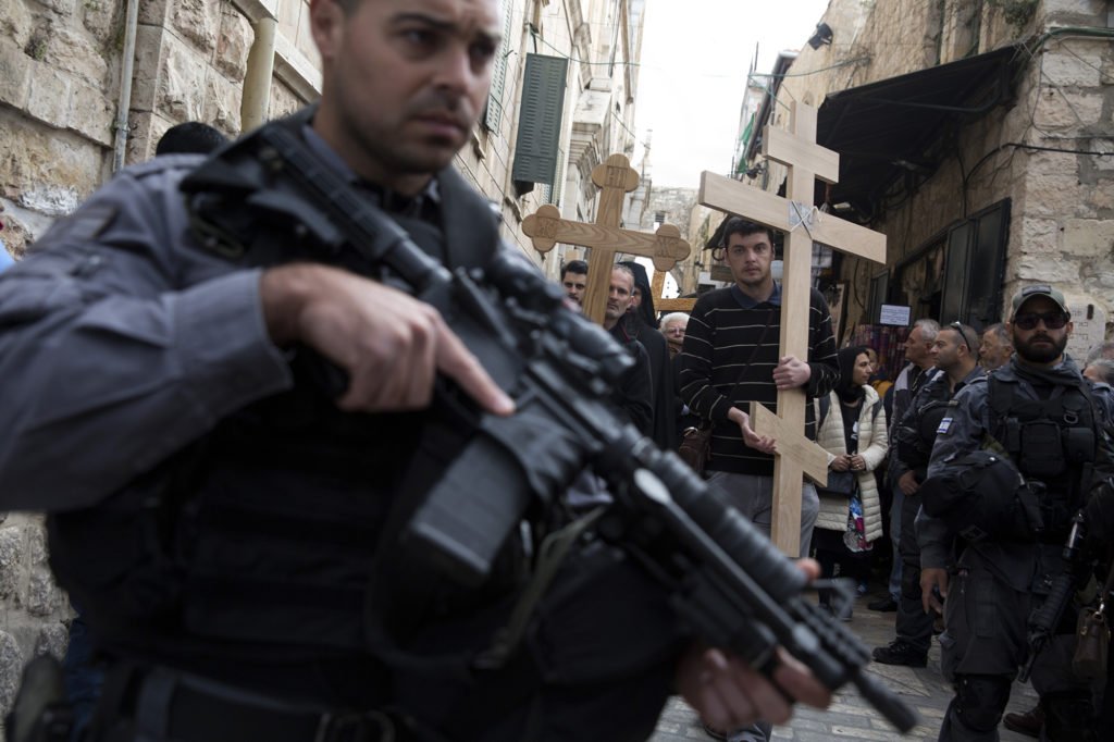 Israeli border police stand on guard as Christian pilgrims from Serbia carry wooden crosses along Via Dolorosa, or “The Way of Sorrow," in the Old City of Jerusalem on April 14, 2017. (Photo by Heidi Levine/GroundTruth)