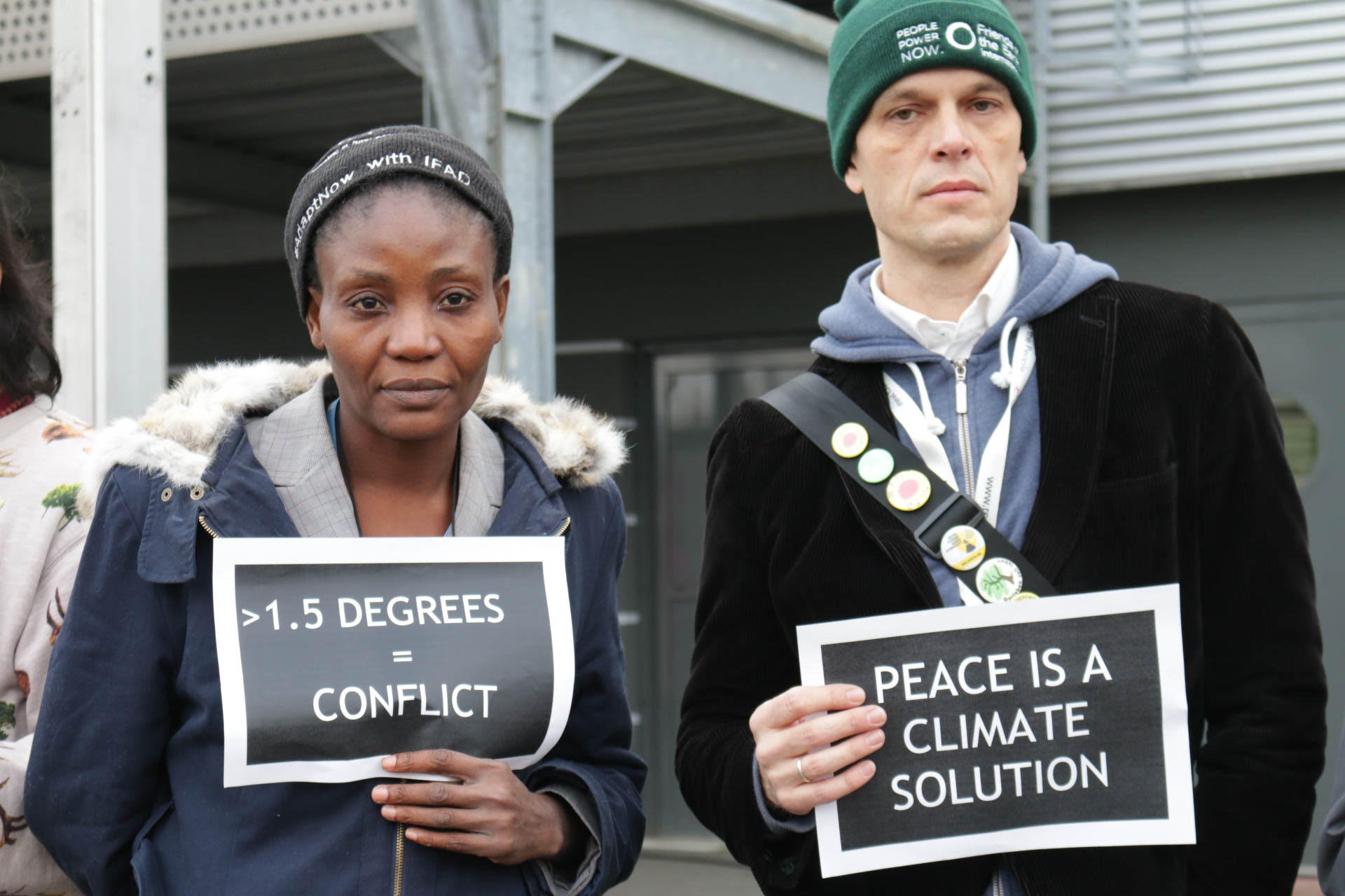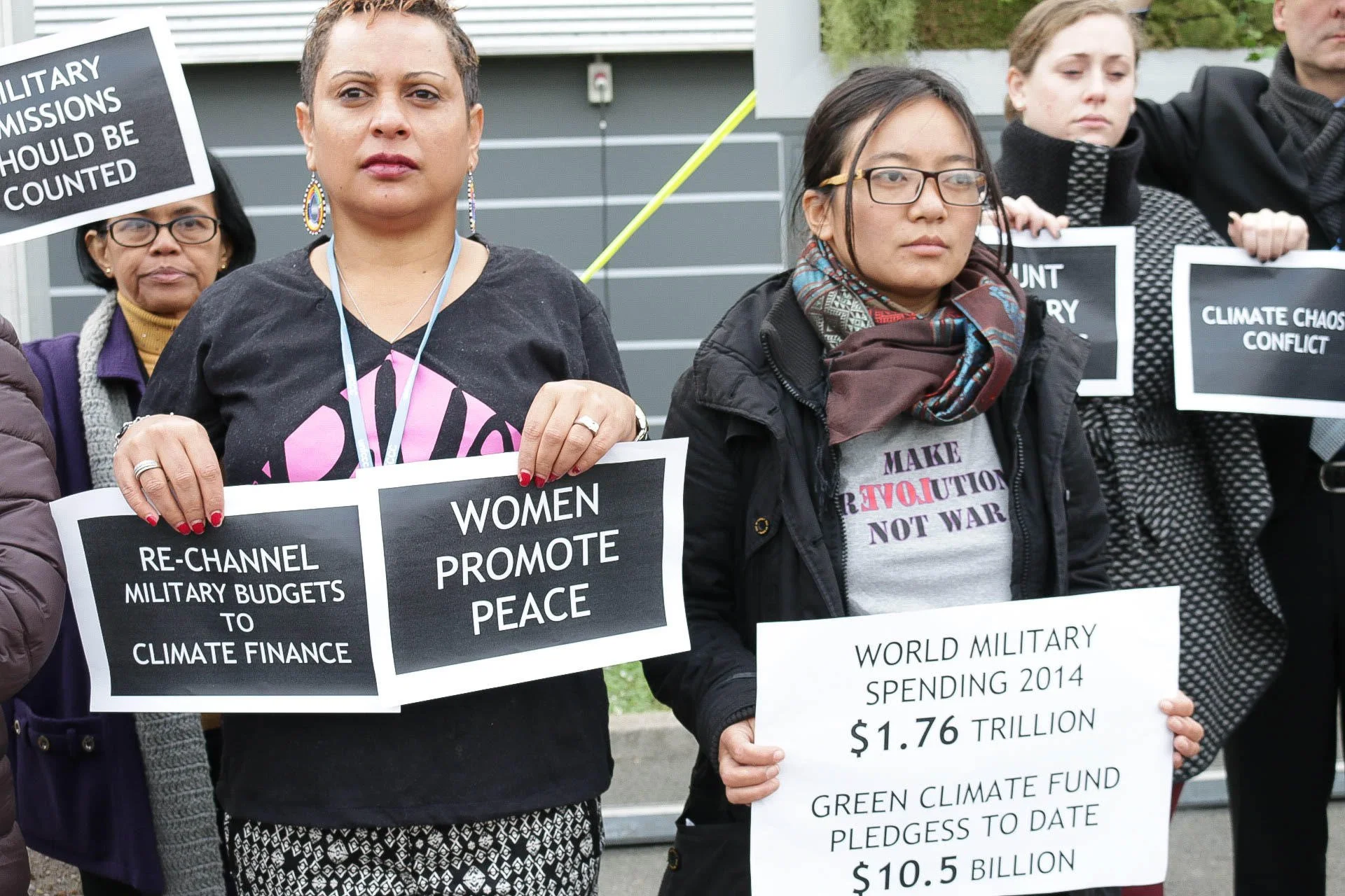 Demonstrators, including Lean Deleon, a Program Associate with Women’s Major Group & Women’s Environment and Development Organization, held a minute-long silent vigil to end their protest. IMG2709: Maria Nailey from Fiji and Alina Saba from Nepal called for less military spending and more contributions to the Green Climate Fund. (Justine Calma/GroundTruth)