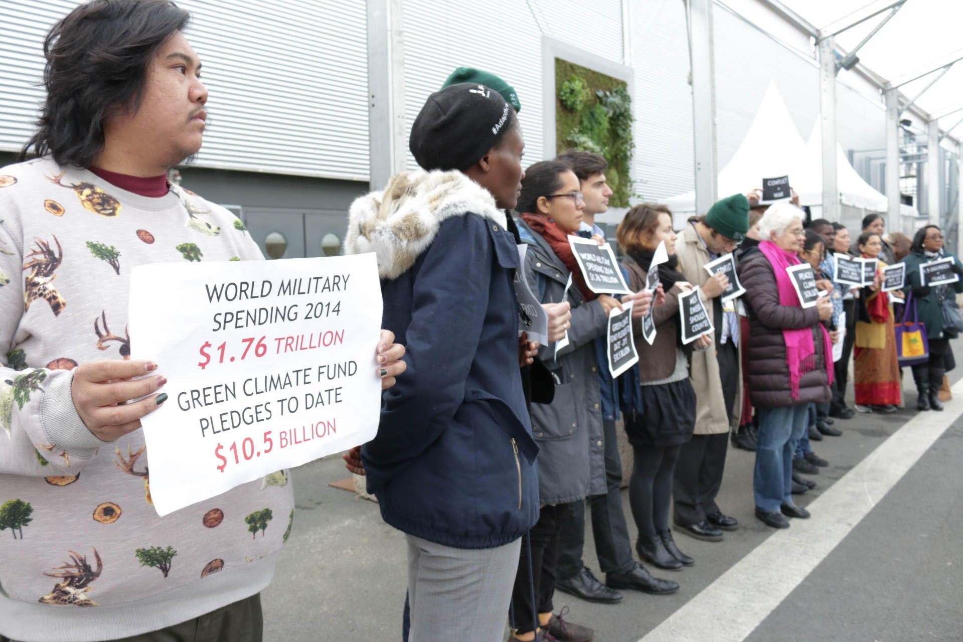 Protesters called for military budgets to be redirected to climate finance instead. Global military spending was $1.7 trillion last year, compared to $10 billion in global commitments made for the Green Climate Fund, the UN-created fund to help developing countries stave off the effects of climate change.