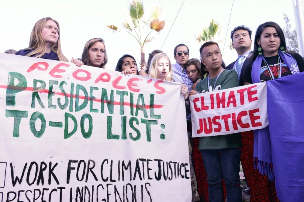 Worried climate justice advocates hold up a to-do list to address climate change and its many effects in lieu of Donald Trump's upcoming U.S. presidency. (Photo by Justine Calma/GroundTruth)
