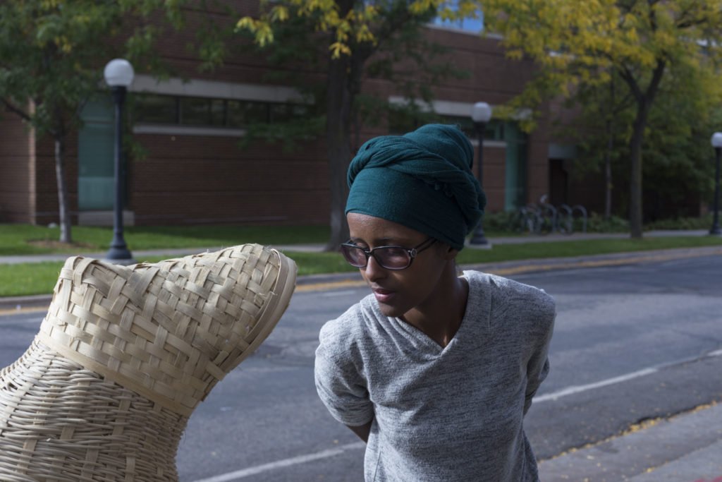 Unlike Argos, whose artform is traditional, his 31-year-old daughter Ifrah Mansour is a multimedia and performance artist. She is known among older women in the community as “the nice and the naked” because she wears pants. Both father and daughter create works for children, but their approaches are different. The oud that Argos plays is a short-neck lute commonly used in Somalia. With it, he performs traditional Somali songs and stops to translate as he sings. Mansour, whose work is currently part of an exhibit at the Minnesota Institute of Art, says her intended audience is generally children who don’t understand the Somali language and who are navigating their complex identities.