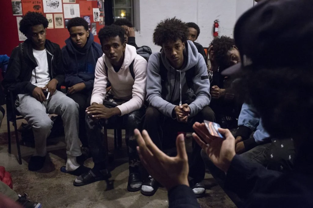 They’re all fans of 20-year-old hip-hop artist and poet, Abduzarak Omar, known as “Sisco,” who organized the group and arranged the space in an effort to raise “political consciousness” among his community’s youth. Omar, with his baggy beanie cap and ponytail, is soft spoken and unimposing but commands the room with a sense of poise beyond his years.