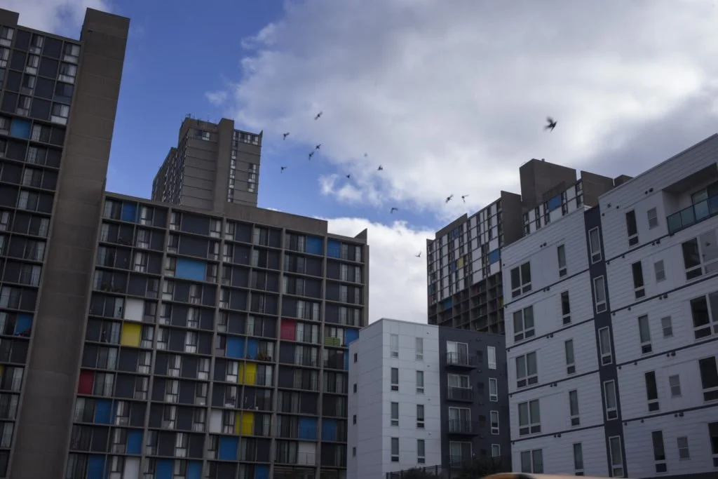 Pigeons flock between apartment buildings in the Cedar-Riverside neighborhood of Minneapolis, Minn., on Thursday, October 12, 2017. (Photo by Brittany Greeson)