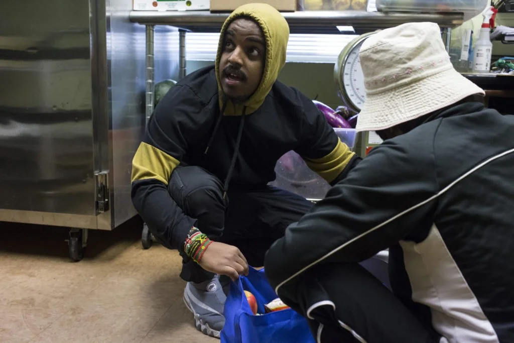 Sisco Omar, 20, works at a food pantry to help community members at the Brian Coyle Center in the Cedar-Riverside neighborhood of Minneapolis, Minn., on Monday, October 9, 2017. (Photo by Brittany Greeson)