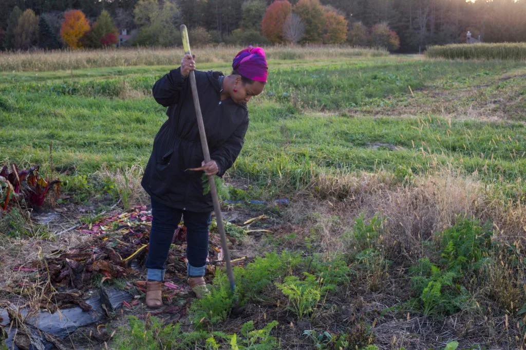 Naima Dhore, 33, works to pull a carrot from her plot of land in Marine on St. Croix, Minn., on Friday, October 13, 2017. (Photo by Brittany Greeson)
