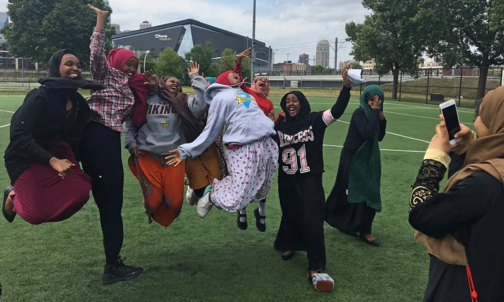 A group of beaming Somali-American high school girls in a synchronized jump on a soccer field in the Cedar-Riverside neighborhood of Minneapolis. (Photo by Fowsiya Husein)