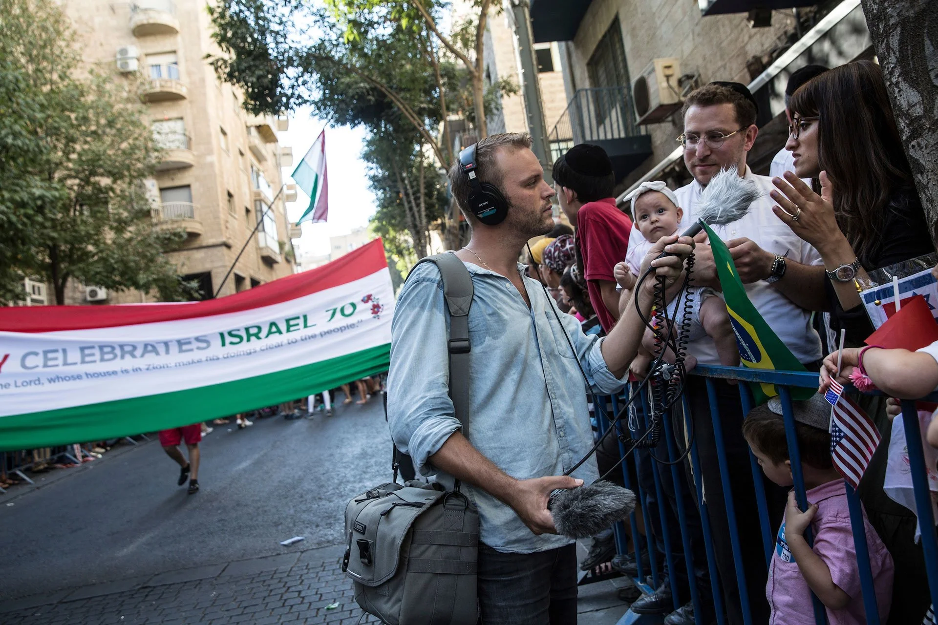 American correspondent Micah Danney interviews Israelis during a parade in Jerusalem on September 27,2018. Thousands of Christians from around the world participated in the march which was one of the major events of the week long Feast of Tabernacles festival also known as Sukkot. (Photo by Heidi Levine/GroundTruth)