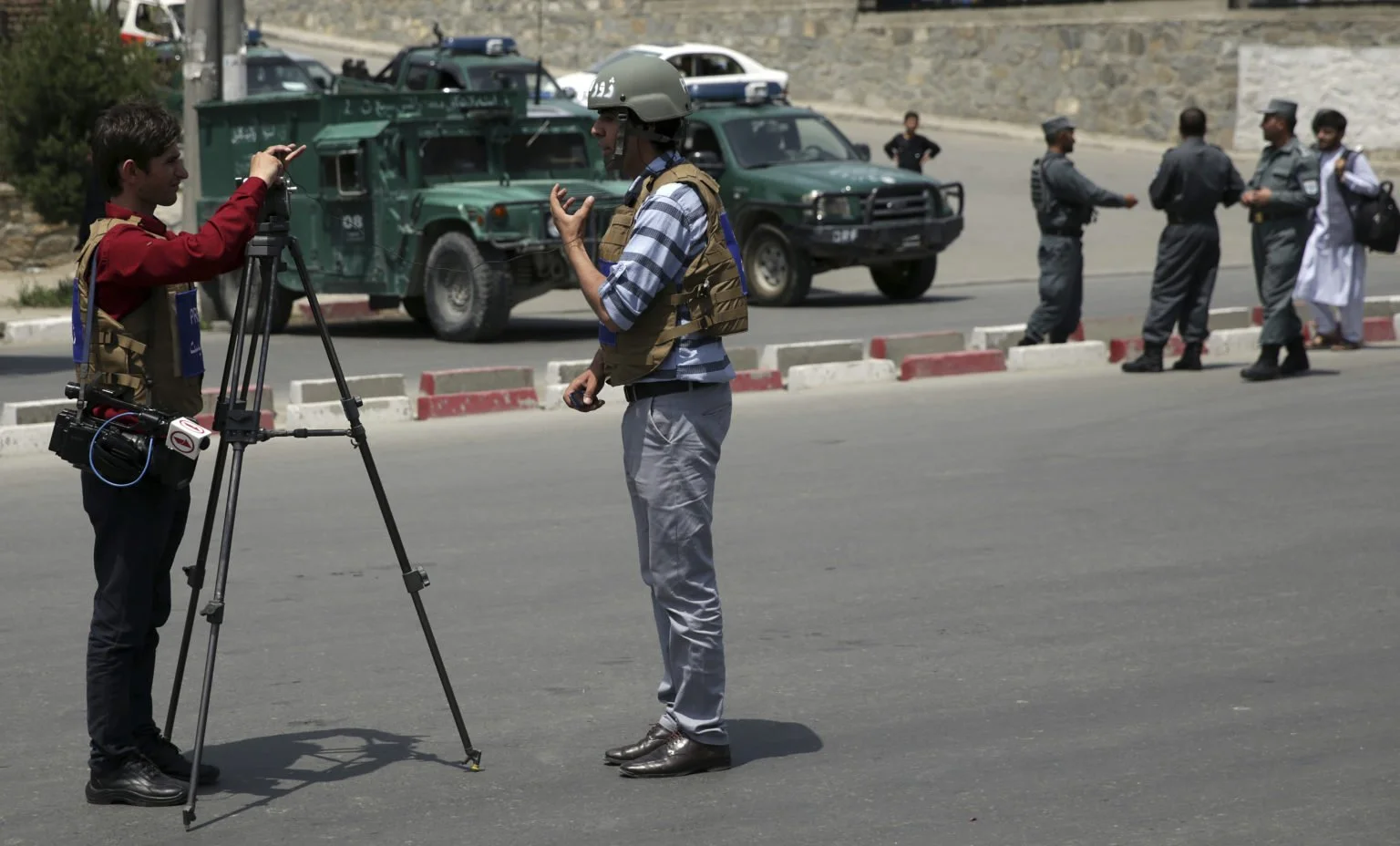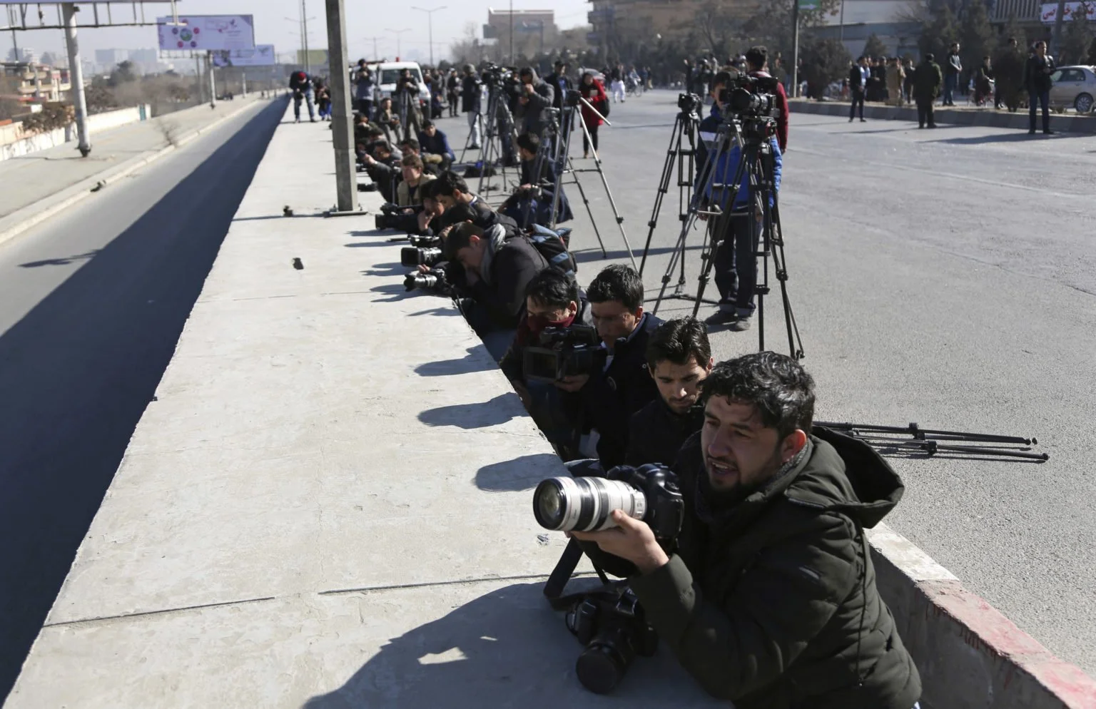 Afghan journalists work behind a barrier at the site of an attack on the Telecommunication Ministry in Kabul, Afghanistan on April 20, 2019. (Photo by Associated Press/Rahmat Gul)