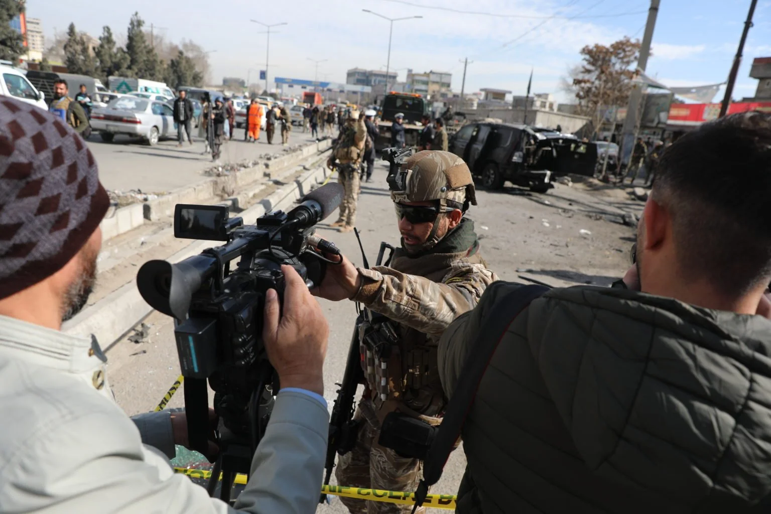 Afghan security police block a TV journalist from filming at the site of bombing attack in Kabul, Afghanistan, Feb. 10, 2021. (Photo by Associated Press/Rahmat Gul)