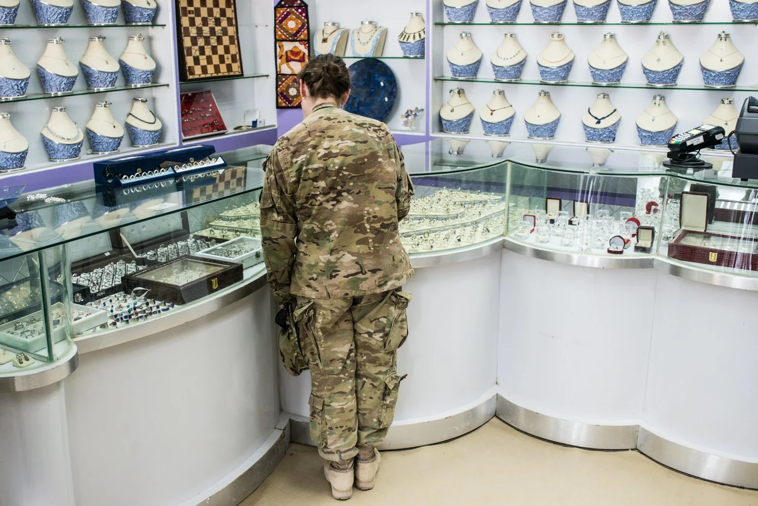 A soldier at Kandahar Airfield shops for jewelry on the 10-year-old store’s last day of business. (Photo by Ben Brody)