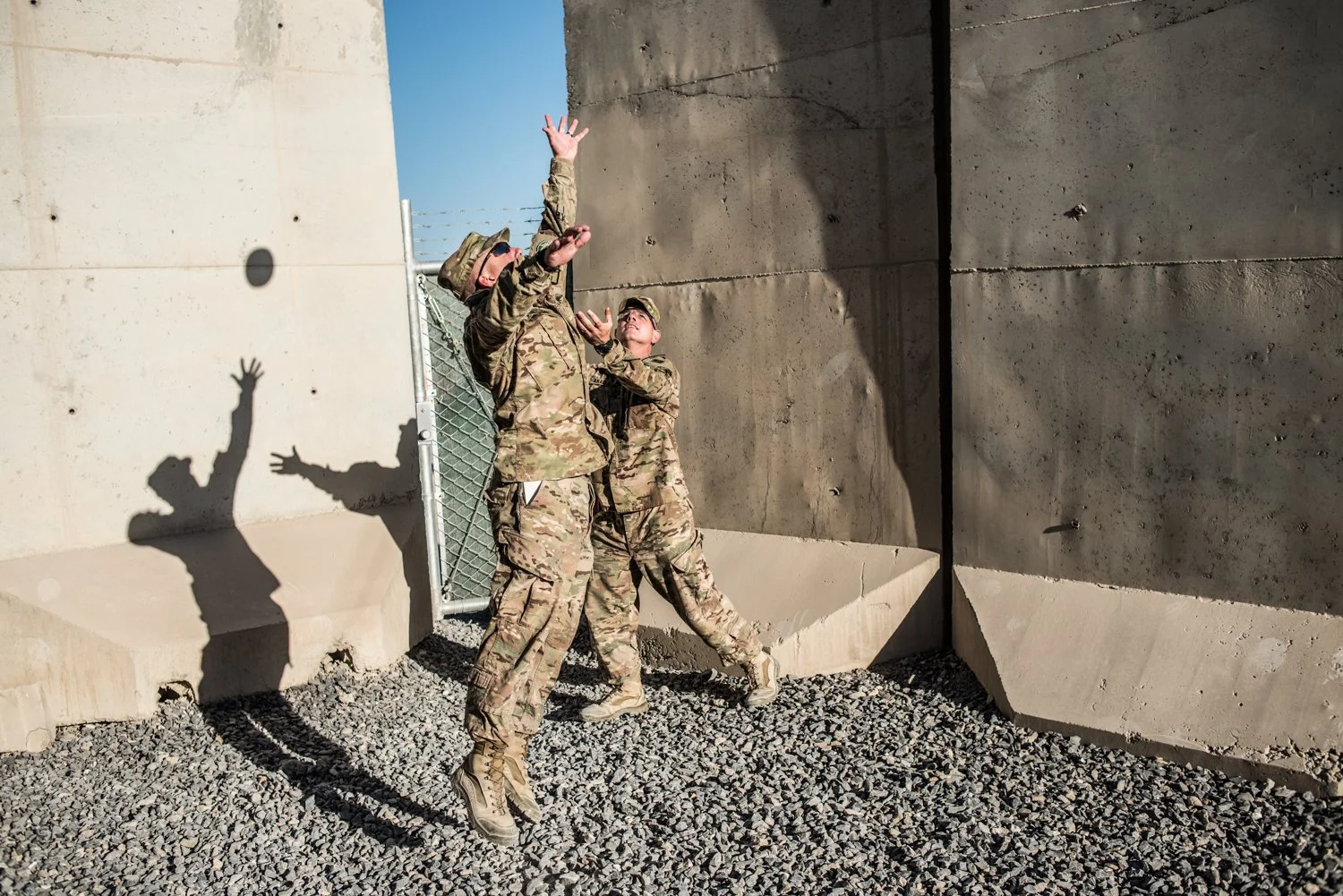 US public affairs soldiers play football within the small, fenced-in compound where reporters are billeted at Kandahar Airfield. In 2013, reporters were not allowed to leave the billets without a military escort – before that they were given the run of the airfield. (Photo by Ben Brody)