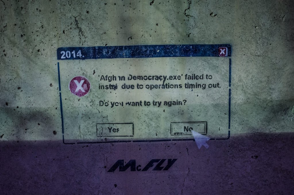 Stenciled on a blast wall at Kandahar Airfield, a soldiers’ gallows humor echoes the uncertainty of Afghanistan’s future. (Photo by Ben Brody)