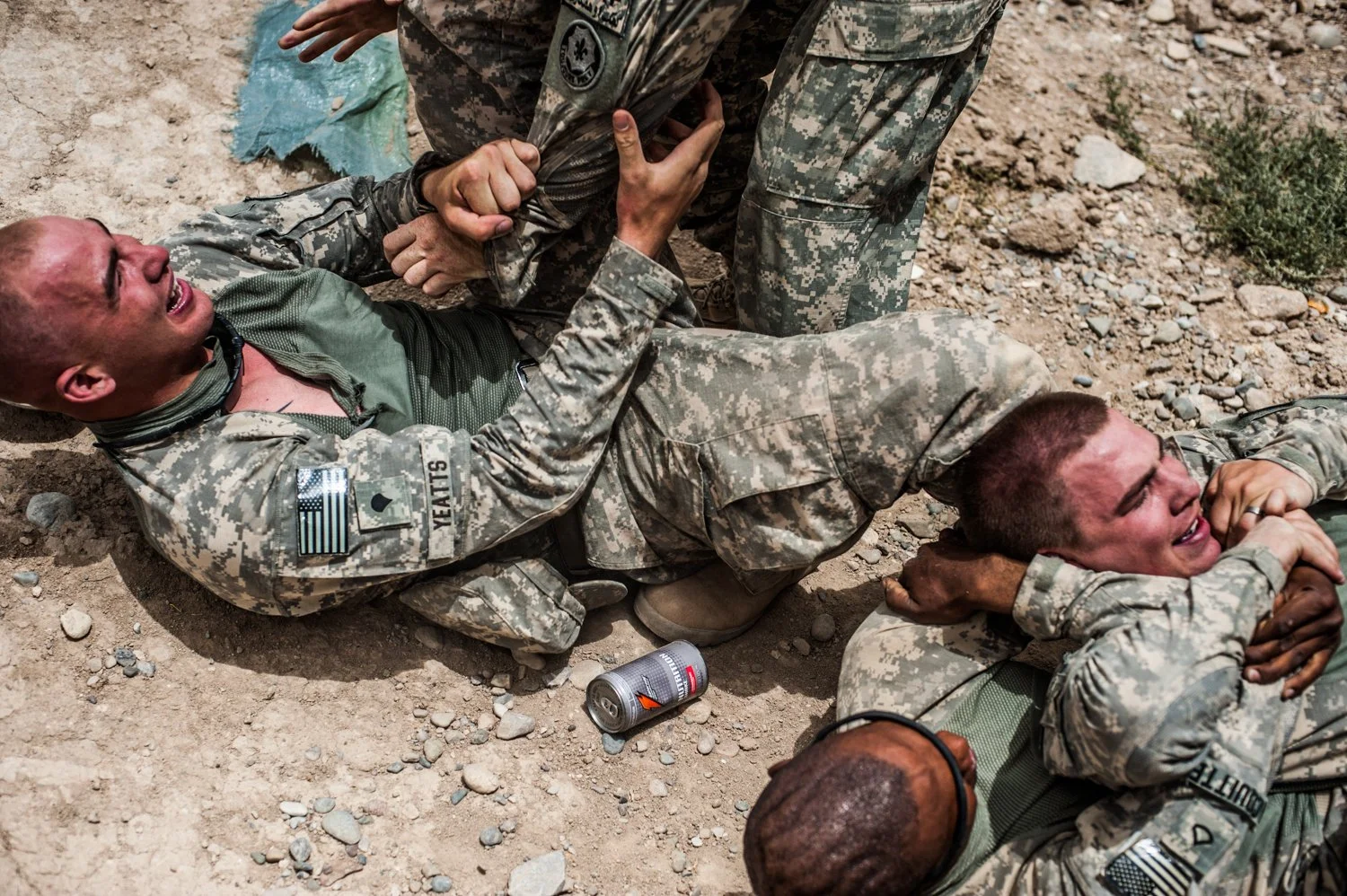 Soldiers wrestle in the dirt during their downtime. Energy drinks and protein shakes are readily available to soldiers at the larger bases. (Photo by Ben Brody/GroundTruth)