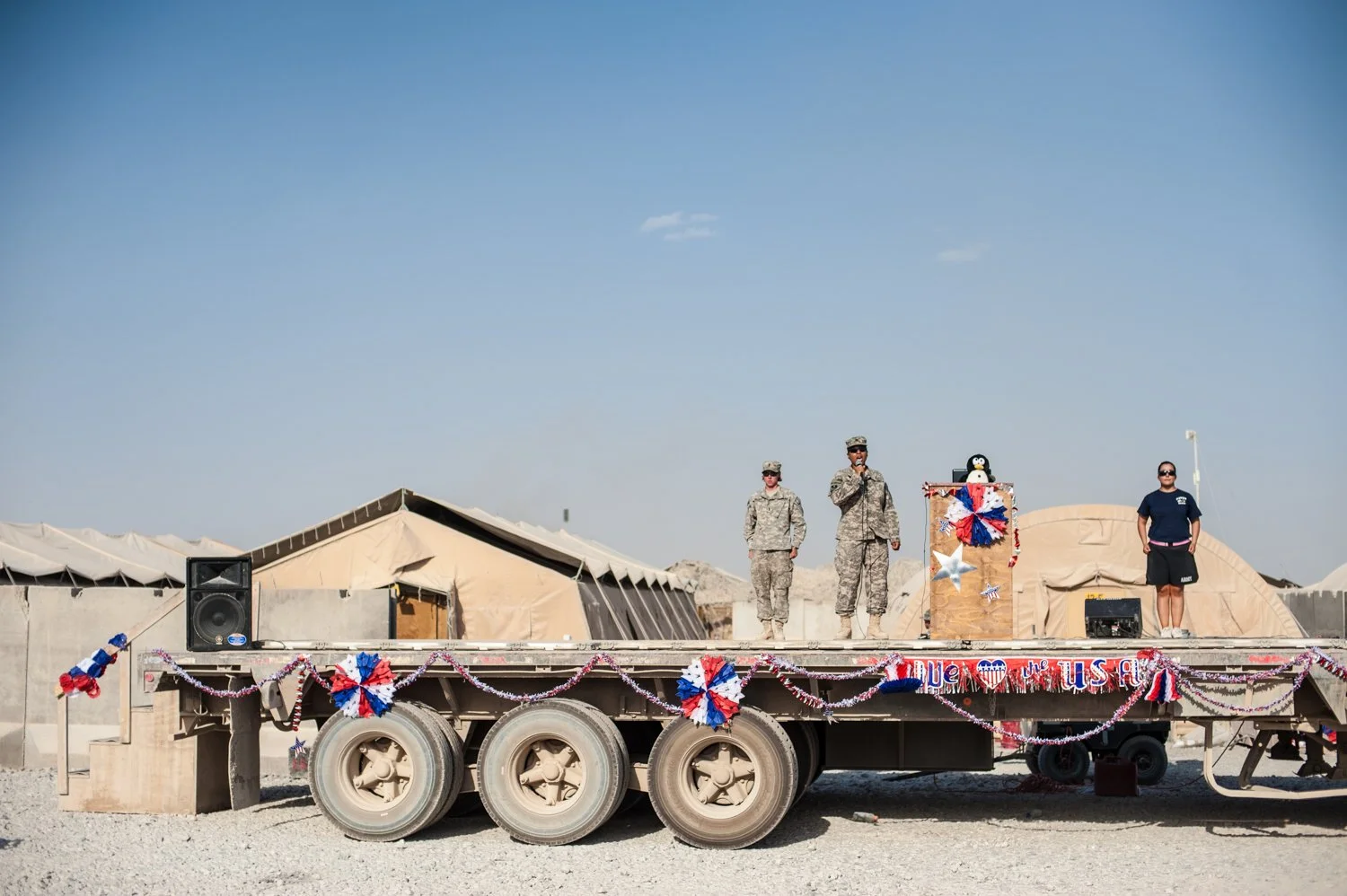 Soldiers celebrate the Fourth of July at Kandahar Airfield during the troop surge in 2010. It was a media frenzy – dozens of reporters lined up to go on patrols with soldiers. In the most violent districts, soldiers would nearly always have an embedded reporter with them. (Photo by Ben Brody/GroundTruth)
