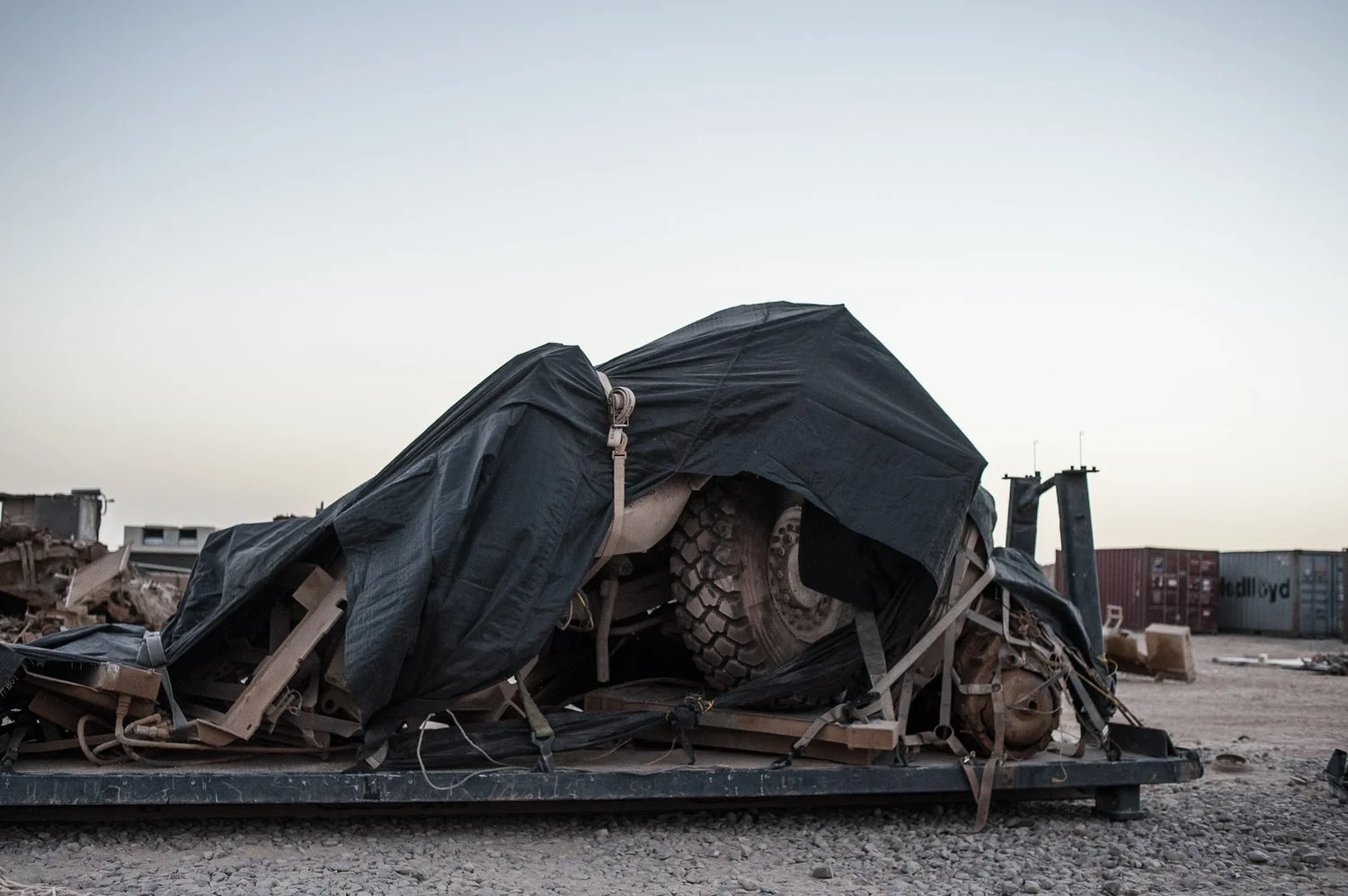 As the military fielded more and more heavily armored trucks in Afghanistan, the Taliban planted bigger and bigger bombs. It is not a technological arms race – Taliban bombs have remained crude for the duration of the war, their components made in local barns rather than in industrial weapons factories. Where the Taliban show increasing sophistication is in their use of propaganda. To prevent the Taliban from photographing destroyed American trucks for their recruitment videos, soldiers cover the wreckage with heavy black tarps before towing them back to base. (Photo by Ben Brody/GroundTruth)