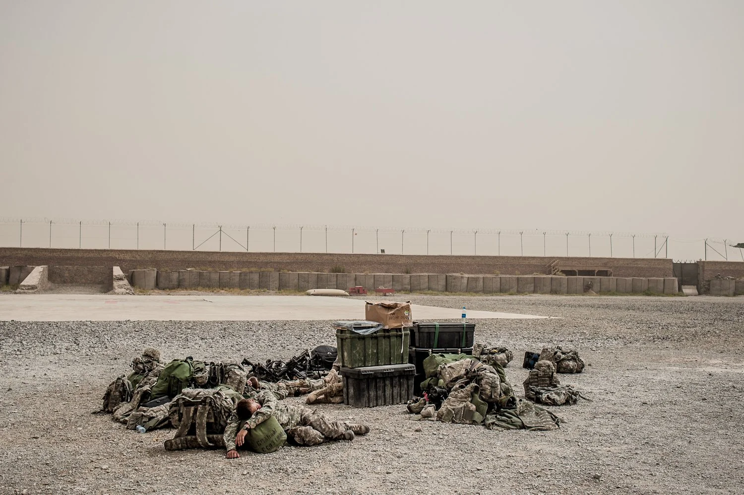 Soldiers sleep next to their gear by the helipad at Kandahar City’s Camp Nathan Smith. The soldiers attempted to begin their trip home to Fort Bragg, N.C., but a dust storm grounded all helicopters. After seven hours of waiting, they accepted defeat and dragged their luggage back to their tents for another attempt the next day. (Photo by Ben Brody/GroundTruth)