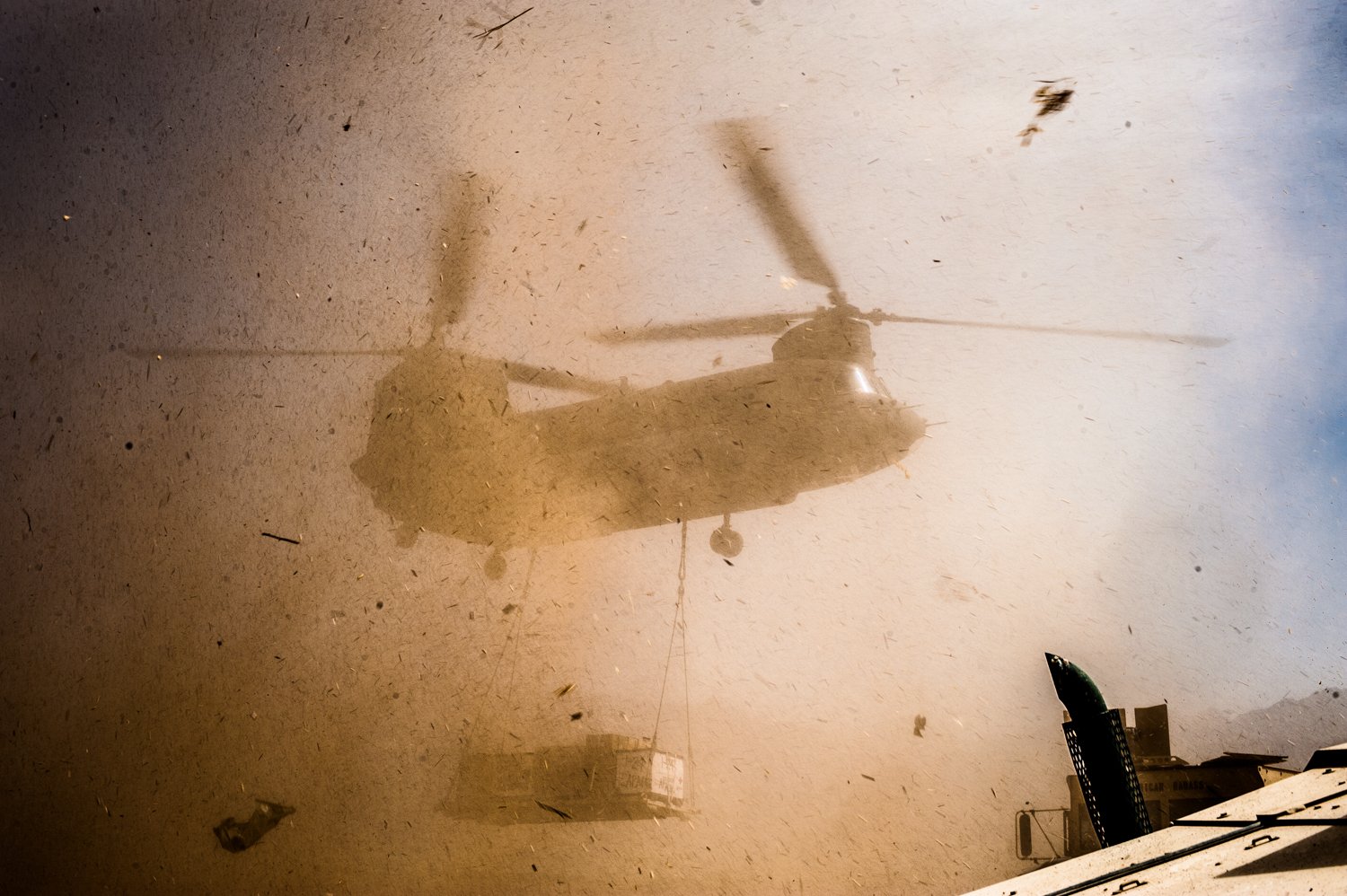 A CH-47 Chinook delivers supplies to a remote army outpost in Zabul Province, blasting debris across the mountainside. (Photo by Ben Brody/GroundTruth)