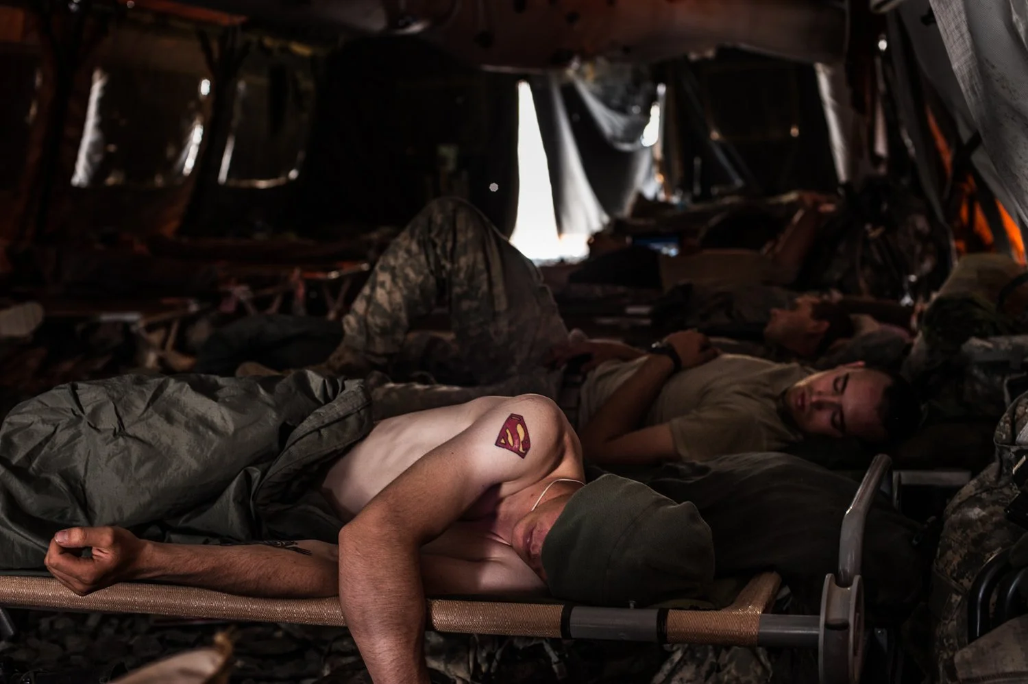Despite stifling heat in the platoon tent, Pfc. Dalton Cooley and his squad sleep after a long mission at Combat Outpost Lakokhel in Kandahar in 2010. Amid grapevine rows and poppy fields, Lakokhel is the Taliban’s heartland, where the movement originally took shape in the mid-1990s in response to the chaos of the Afghan civil war. As the US occupation became more arbitrarily violent, the Taliban regained popular support in these rural areas. (Photo by Ben Brody/GroundTruth)