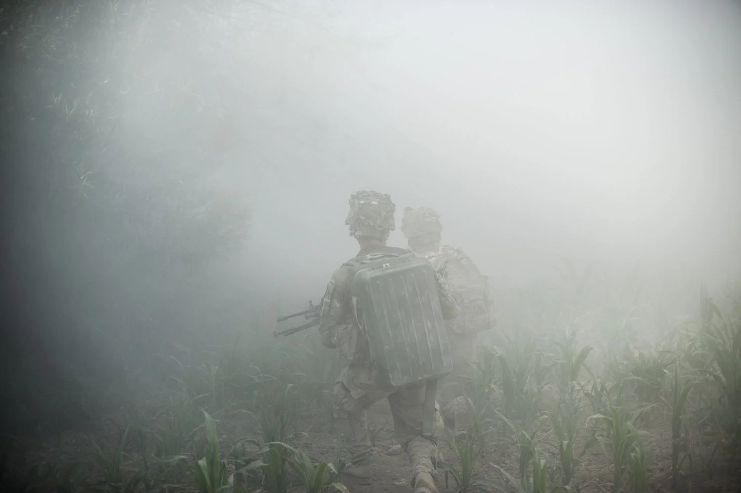 Soldiers navigate through drifting smoke after a large explosion in Kandahar. (Photo by Ben Brody/GroundTruth)
