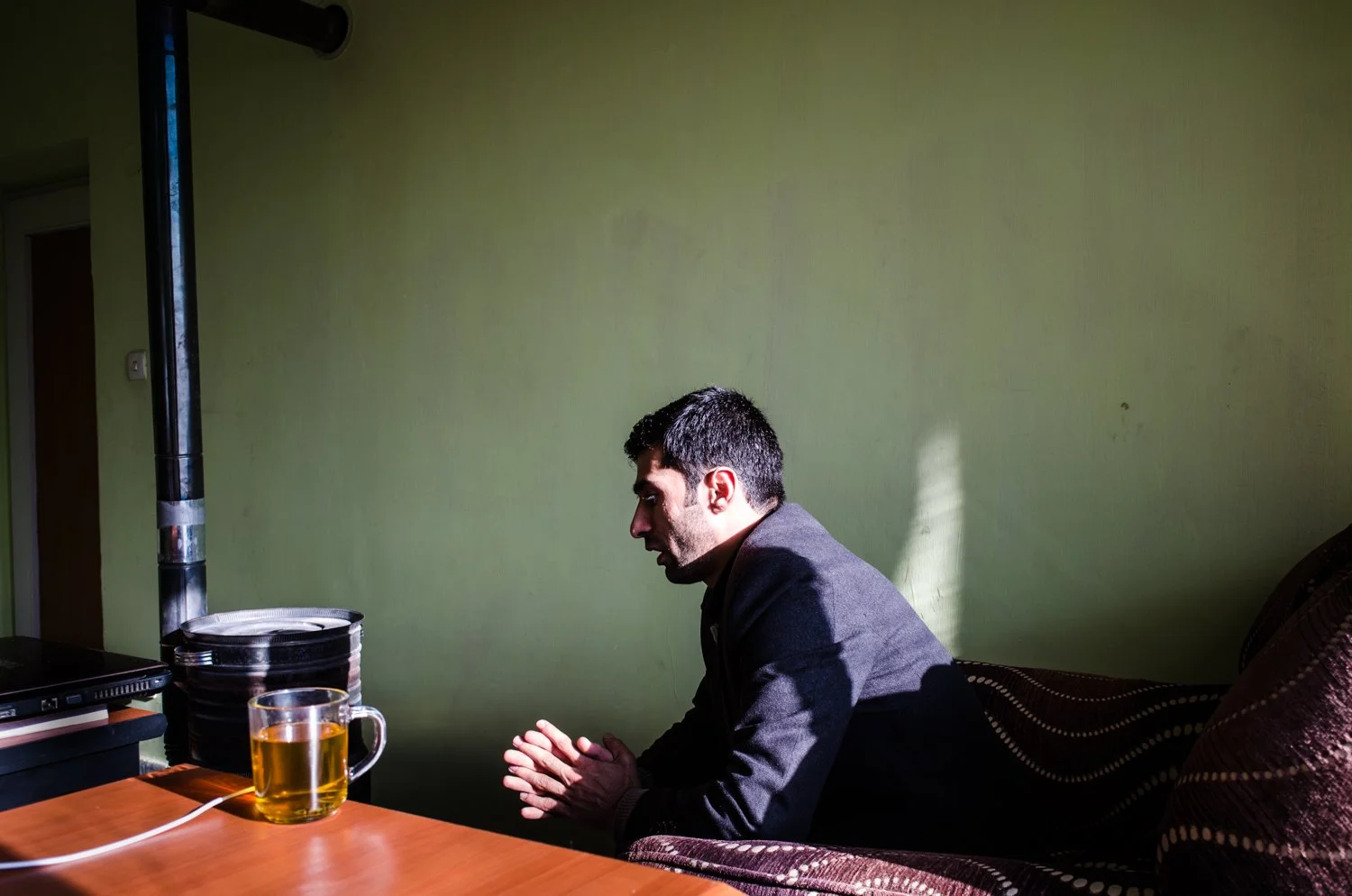 On a frigid day in 2015, Afghan poet and public intellectual Reza Fazli warms his hands on a woodstove in Kabul after most of the US soldiers have left Afghanistan. (Photo by Ben Brody/GroundTruth)