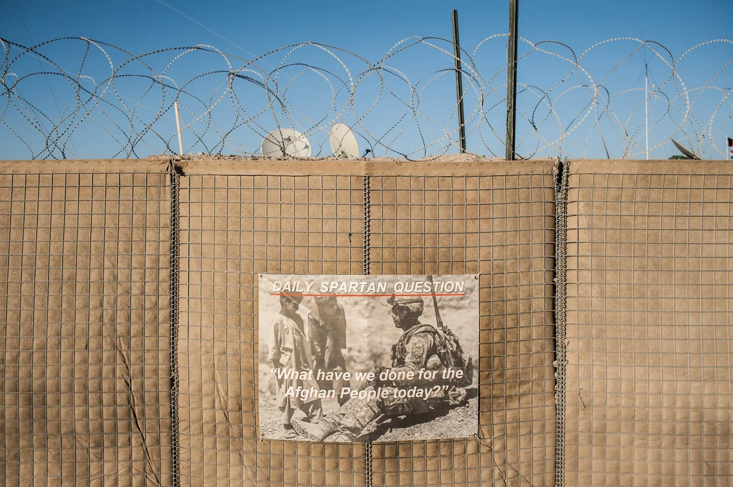 On a Kandahar outpost, soldiers hang motivational posters on blast walls ringed with concertina wire, walling themselves off from Afghanistan. (Photo by Ben Brody/GroundTruth)
