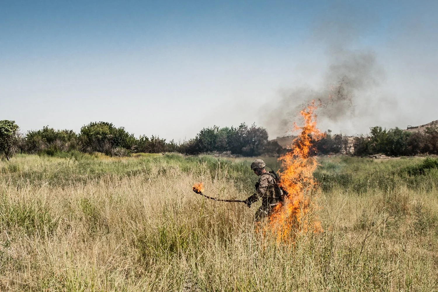Marine Cpl. Robert Roskowski starts a fire to clear vegetation before searching for land mines by hand. The fields around Helmand’s Kajaki Dam are sown with the Taliban’s homemade mines, as well as Soviet land mines from the 1980s. (Photo by Ben Brody/GroundTruth)
