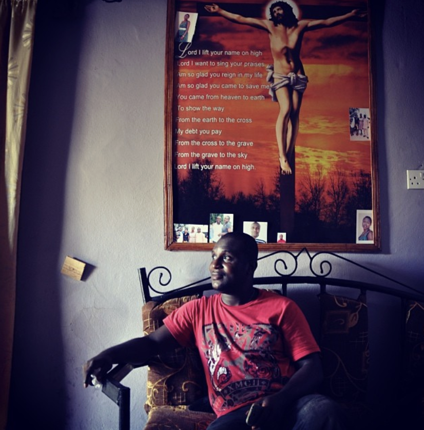 “There are lots of things these unemployed people could be doing,” he says, a painting of the famous biblical passage of Jesus teaching his followers how to fish hovering above him. “You can’t wait around for opportunities in Nigeria.”