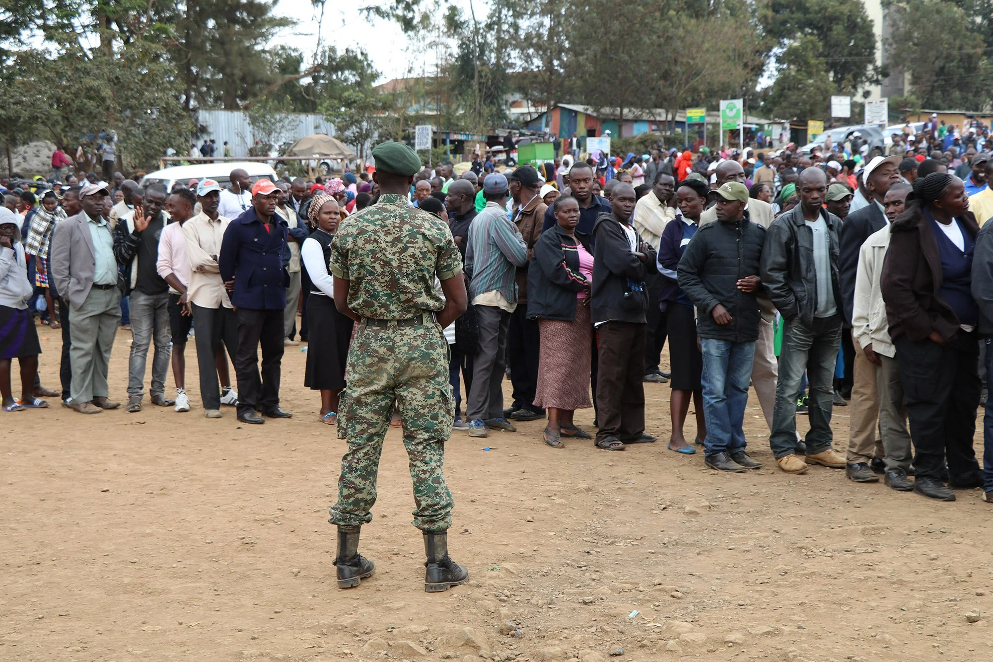 Over 180,000 police officers and security forces were deployed across Kenya to prevent violent riots. Here, a guard watches over long voting cues in Kibera slum, Nairobi. (Neha Wadekar/GroundTruth)